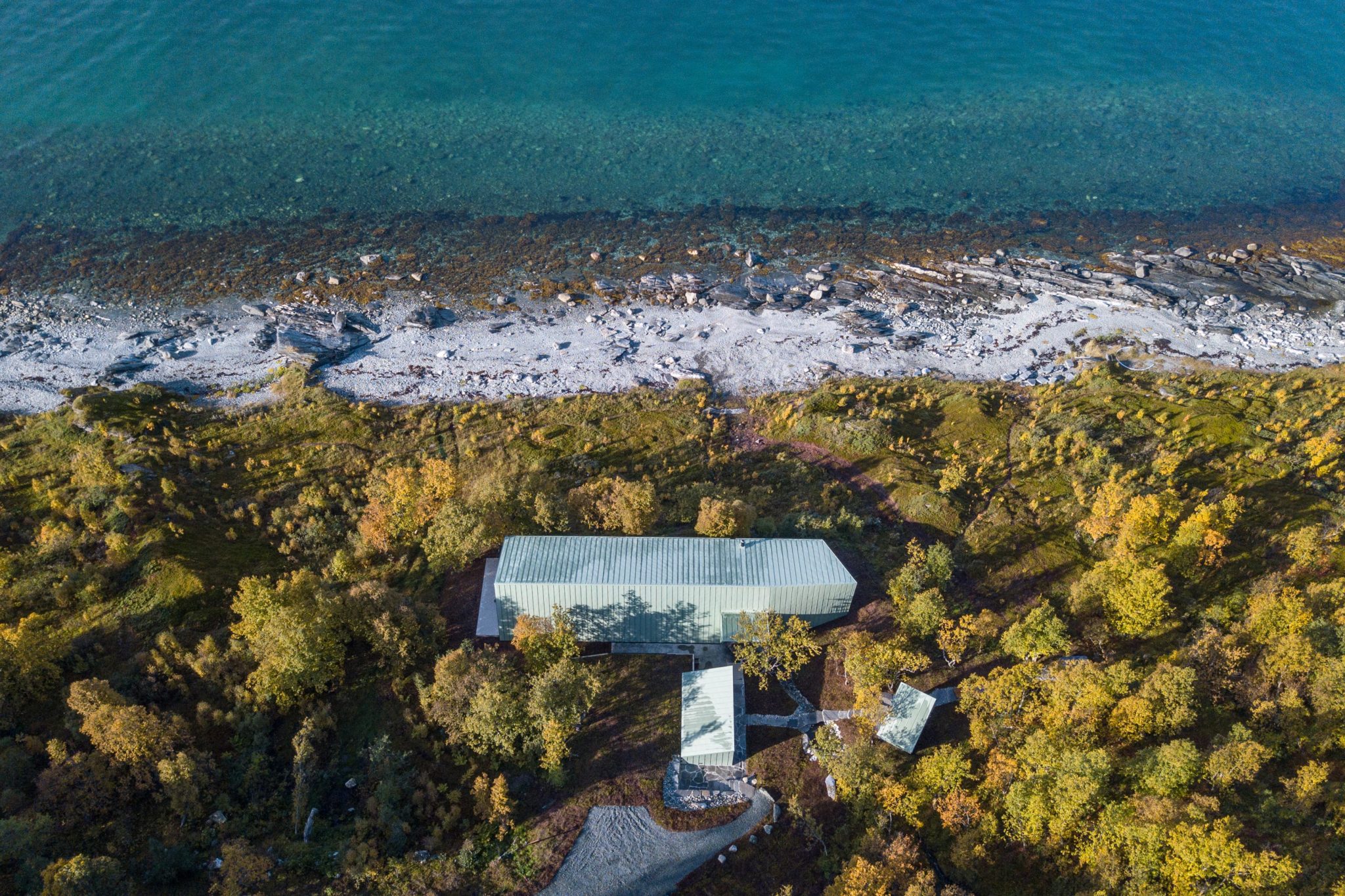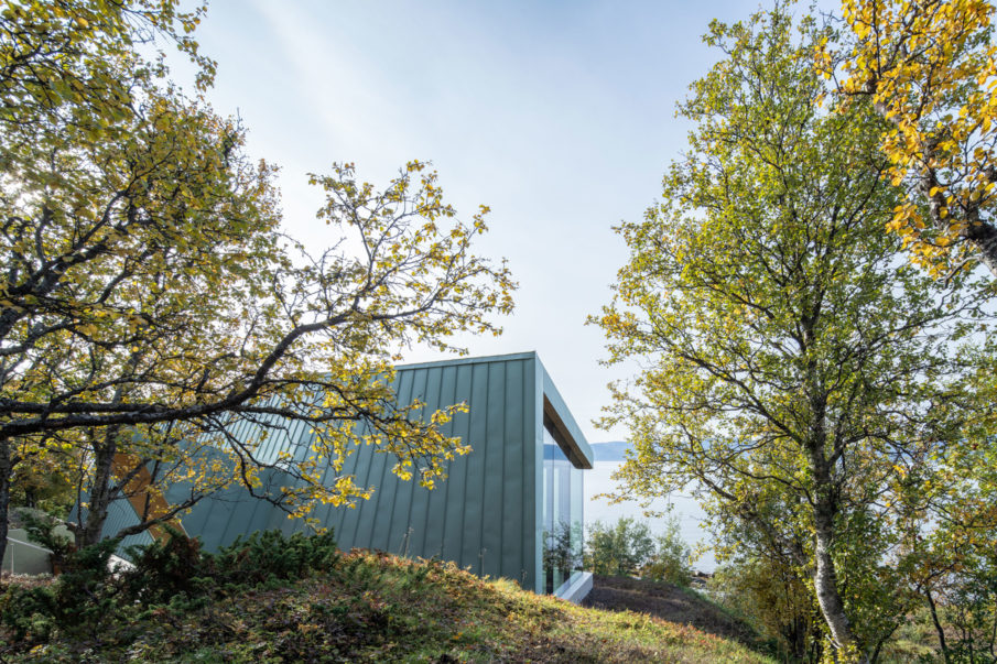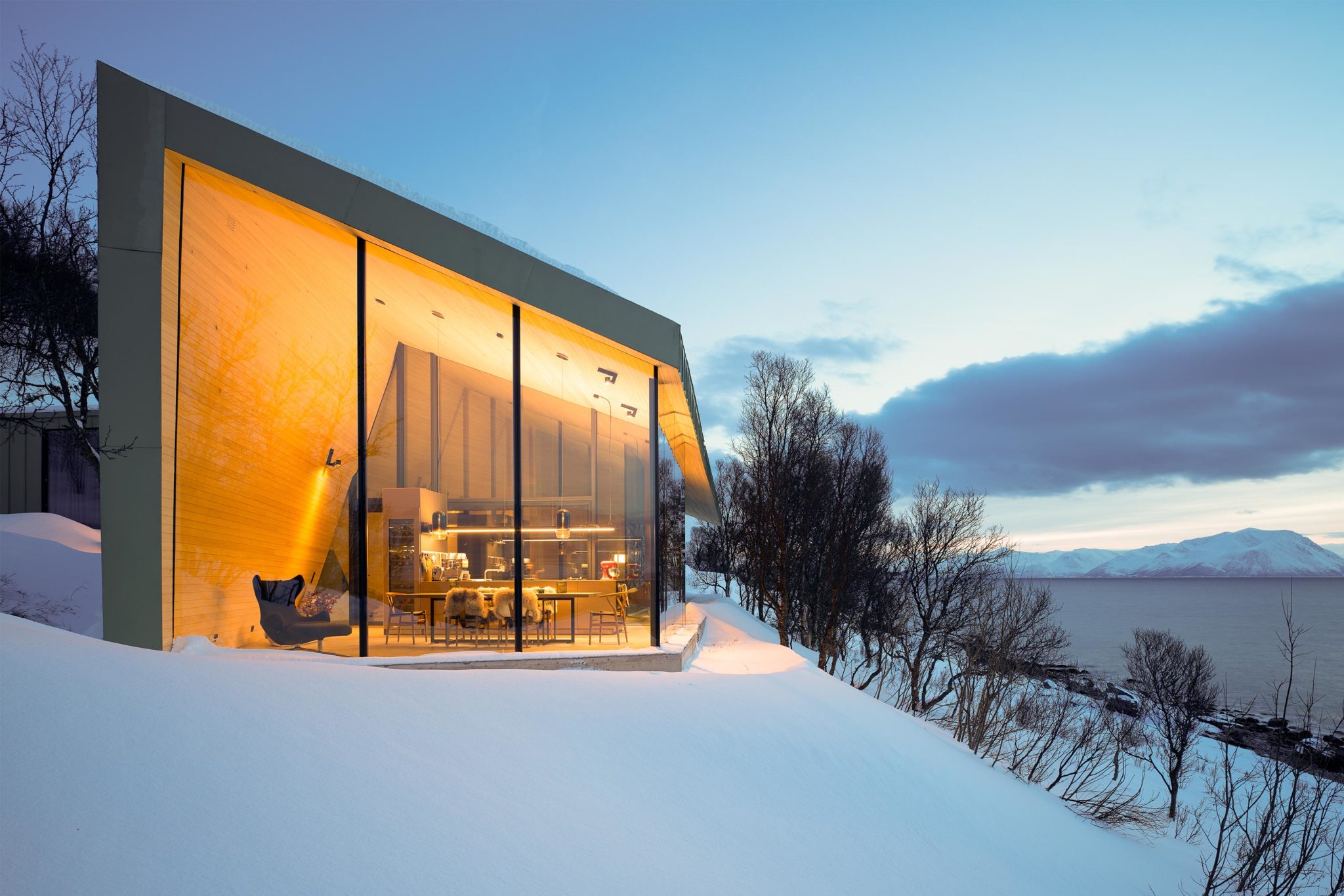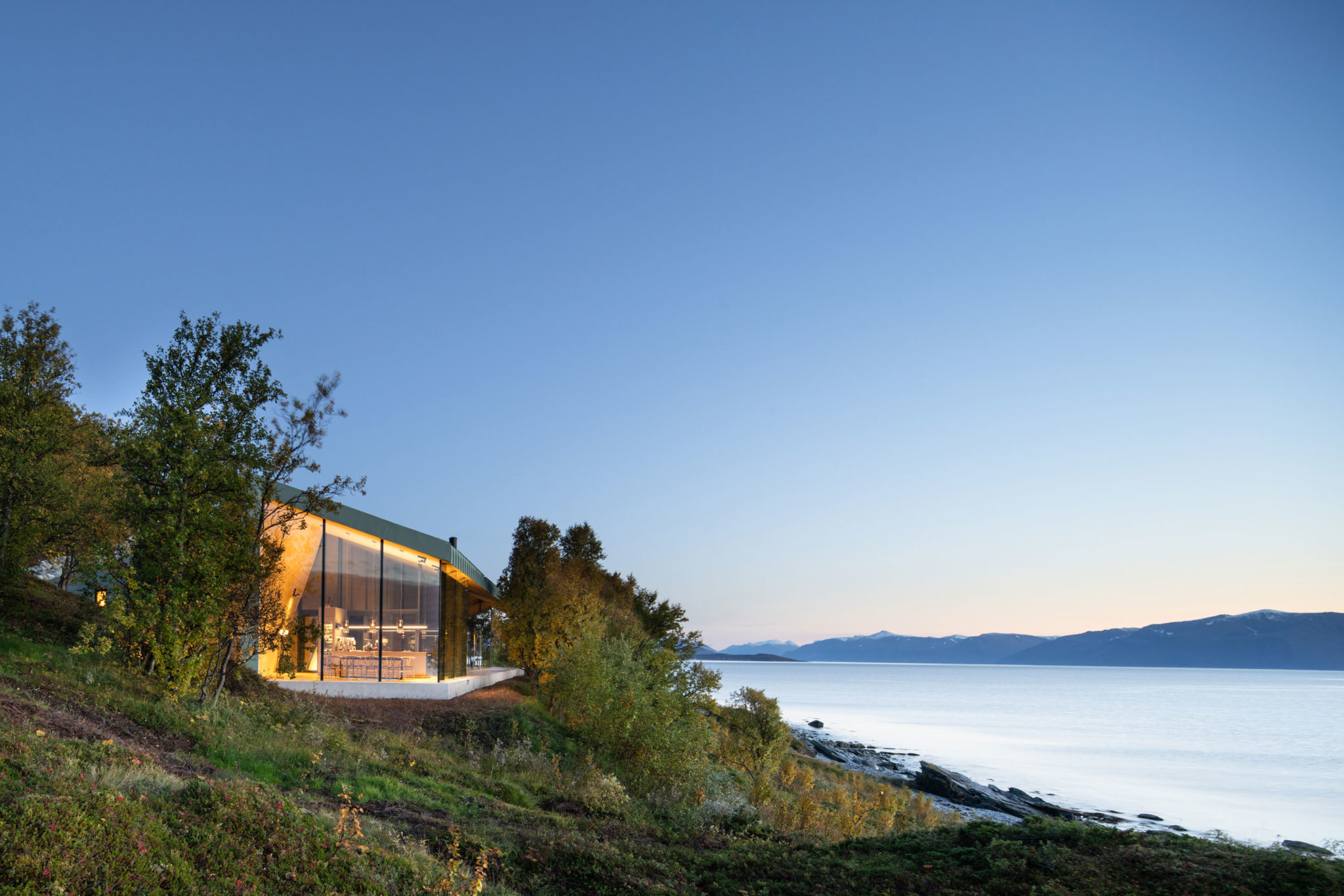Located in the remote Lyngen Alps, this project is partly a private retreat and a small lodge. Organised within a main structure comprising two units and terraces, a separate suite and a sauna across the creek. Respecting nature as the key inspiration for this project, the design endeavours to complement the site, with the main building stretching out across the natural plateau. High ceilings and seamless glass walls invite the sky and landscape into the building.
