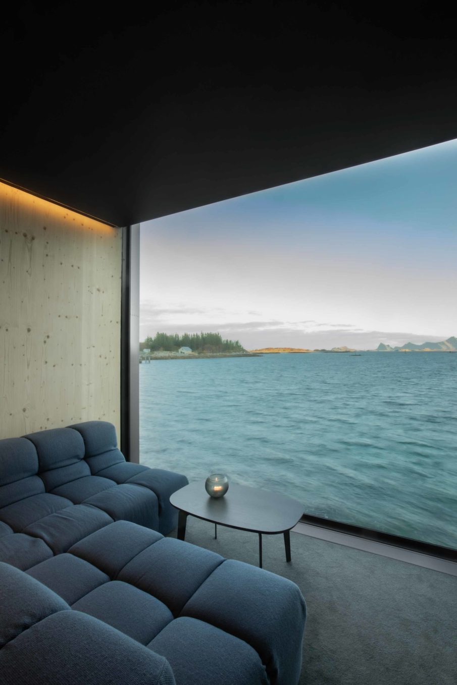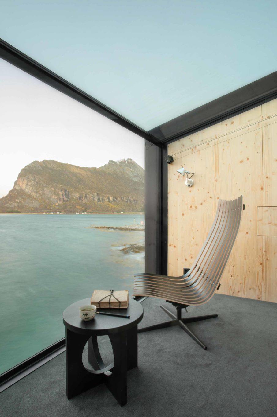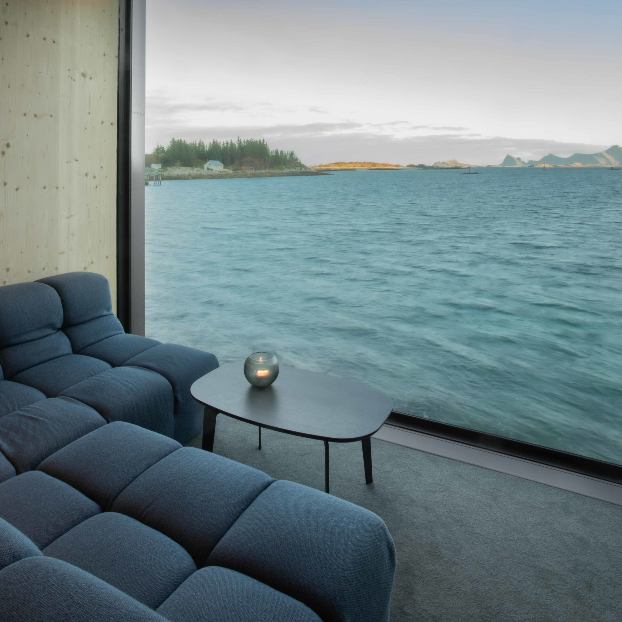 The interior of the Two Towers at Manshausen Island is designed to forge an intimate connection with the dramatic surroundings, offering both comfort and an immersive experience of nature. Positioned on the edge of a stone quay, the towers maximize the panoramic views of the surrounding sea and sky, allowing guests to feel deeply connected to the ever-changing landscape outside.