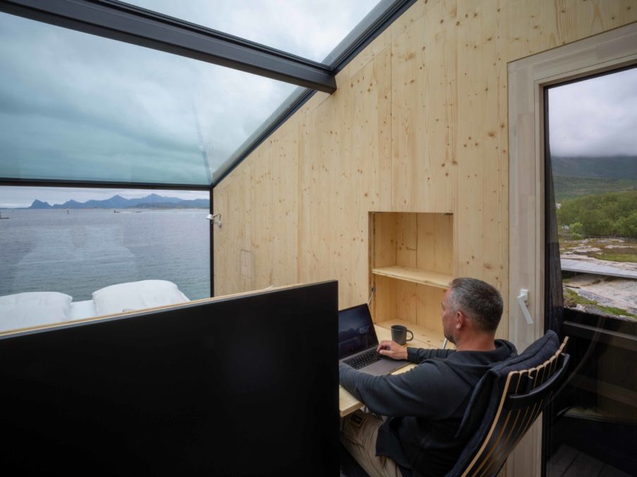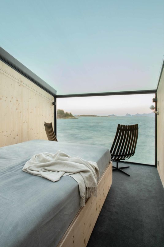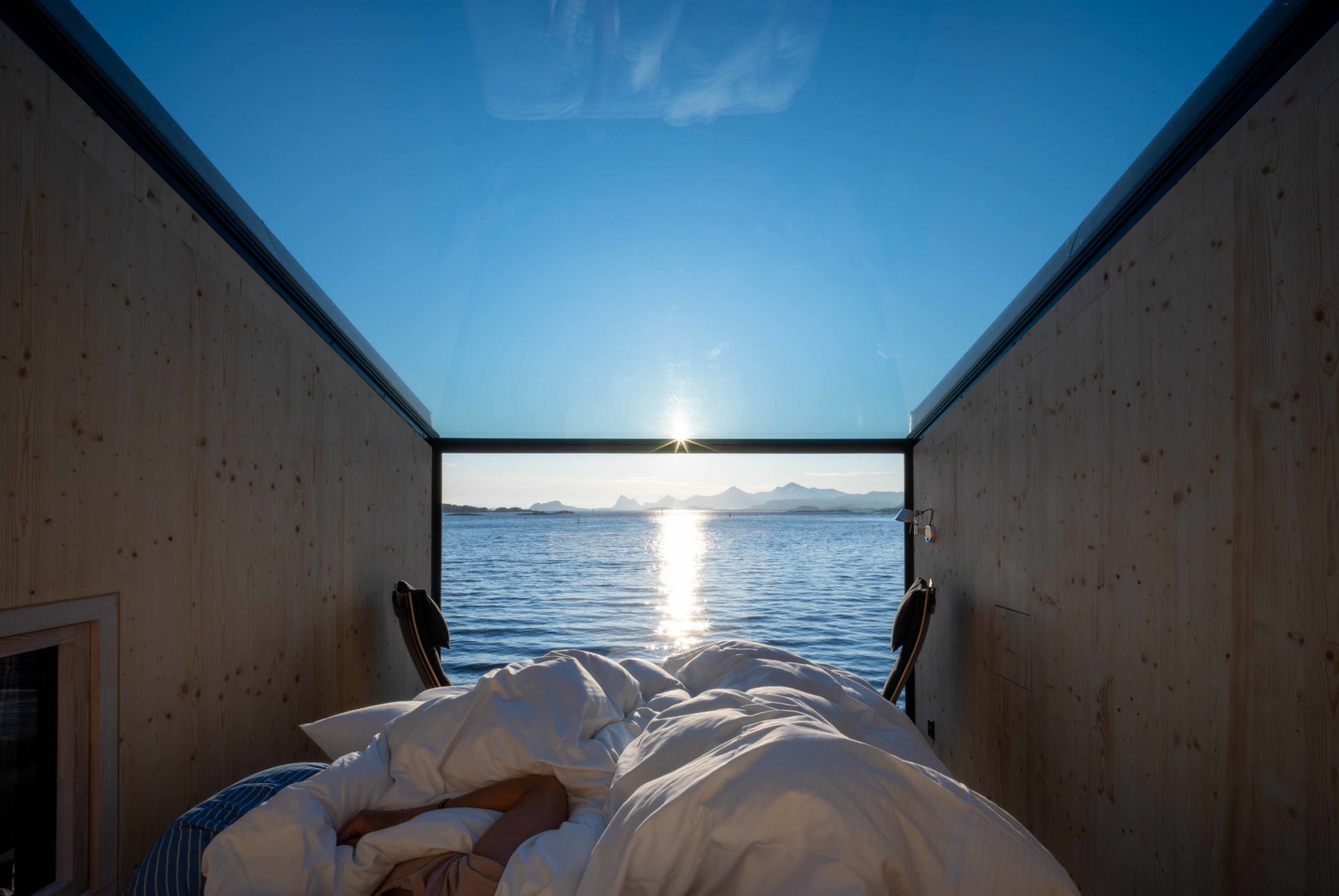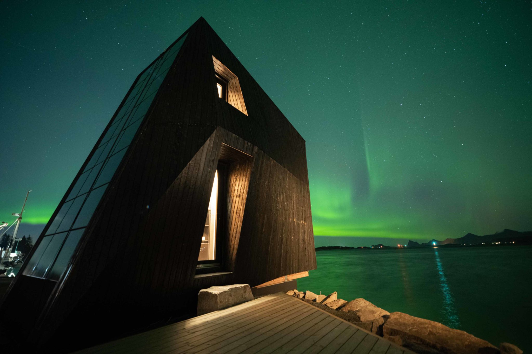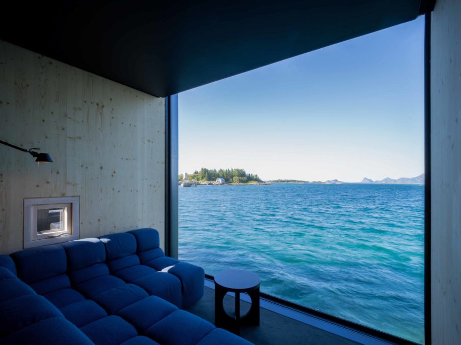 The interior of the Two Towers at Manshausen Island is designed to forge an intimate connection with the dramatic surroundings, offering both comfort and an immersive experience of nature. Positioned on the edge of a stone quay, the towers maximize the panoramic views of the surrounding sea and sky, allowing guests to feel deeply connected to the ever-changing landscape outside.