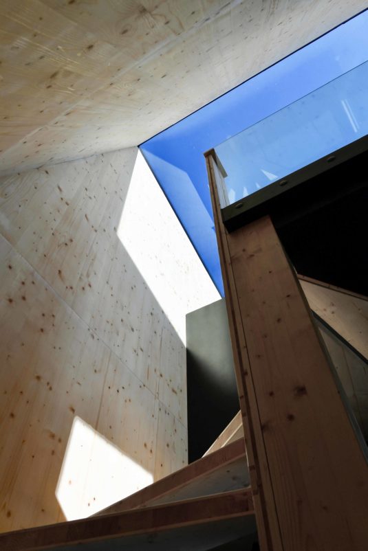 Upstairs, each tower transforms into a personal sanctuary beneath the sky. The full glass roof offers uninterrupted views of the Arctic sky – whether it’s the mesmerizing northern lights or the midnight sun. The custom queen-size bed, outfitted with DUX mattresses, is positioned to make the most of the breathtaking vistas, with the slanted backrest enhancing the experience.